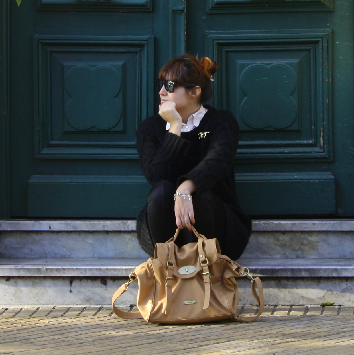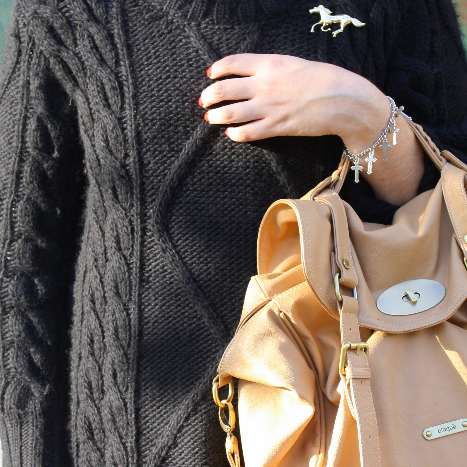 En estas últimas pics no quería dejar de mostrarles los detalles. Soy fanática de los prendedores, que creo que realzan cualquier outfit. Lo acompañe con la pulsera de cruces, que la adoro que ya les mostré en otra oportunidad. A todo el conjunto lo corté con la cartera Alexa (imitación by Blaquè) color nude que corta totalmente el total black! ja Qué les parece? Vieron el detalle del tejido, esta súper trabajado!! =)