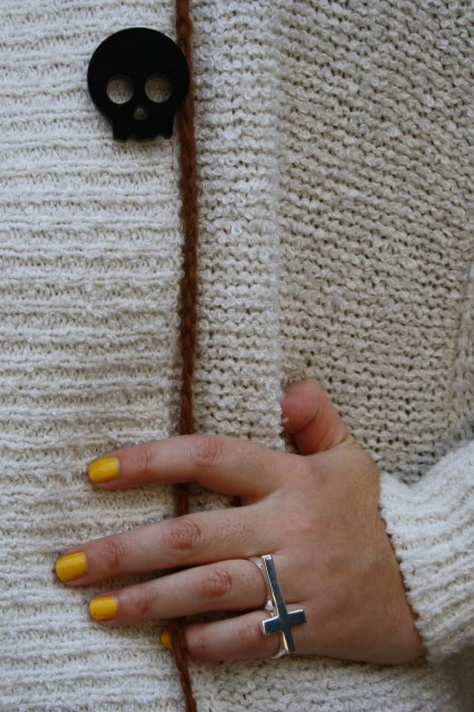 Por supuesto lo acompañe con un sacón que es herencia de mi mami. Es súper abrigado, sí! ya saben que no me gusta pasar frío, y además combinaba a la perfección con la carterita. Me gusta el prendedor, que corta lo rústico. Vuelven con todo las calaveras, de hecho ví un prendedor similar en la ultima colección de AY NOT DEAD, este es de Complot de varias temporadas atrás. Como siempre me decía mi mamá y yo le decía nada que ver: TODO VUELVE CHIC@S!!! ( Tenías razón má!)