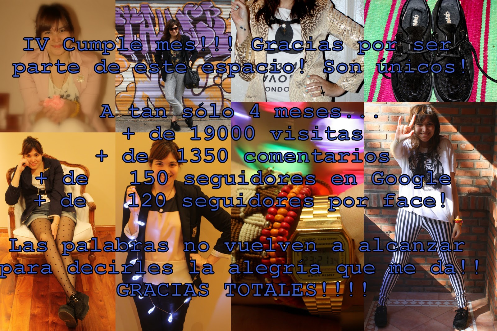 6. Me encanta todo esto. Yo recien empiezo con mi blog y la verdad es que es muy dificil encontrarle tiempo porque soy de esas personas que hacen algo todo el tiempo! Me siento inutil sentada en mi casa y generalmente me conecto a la noche. Problema ya que de noche es dificil sacar buenos shots! Me alegro por tus cuatro hermosos meses. Te sigo! Te espero por mi blog!