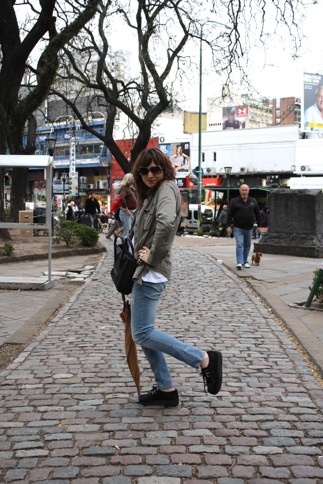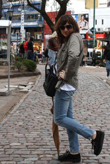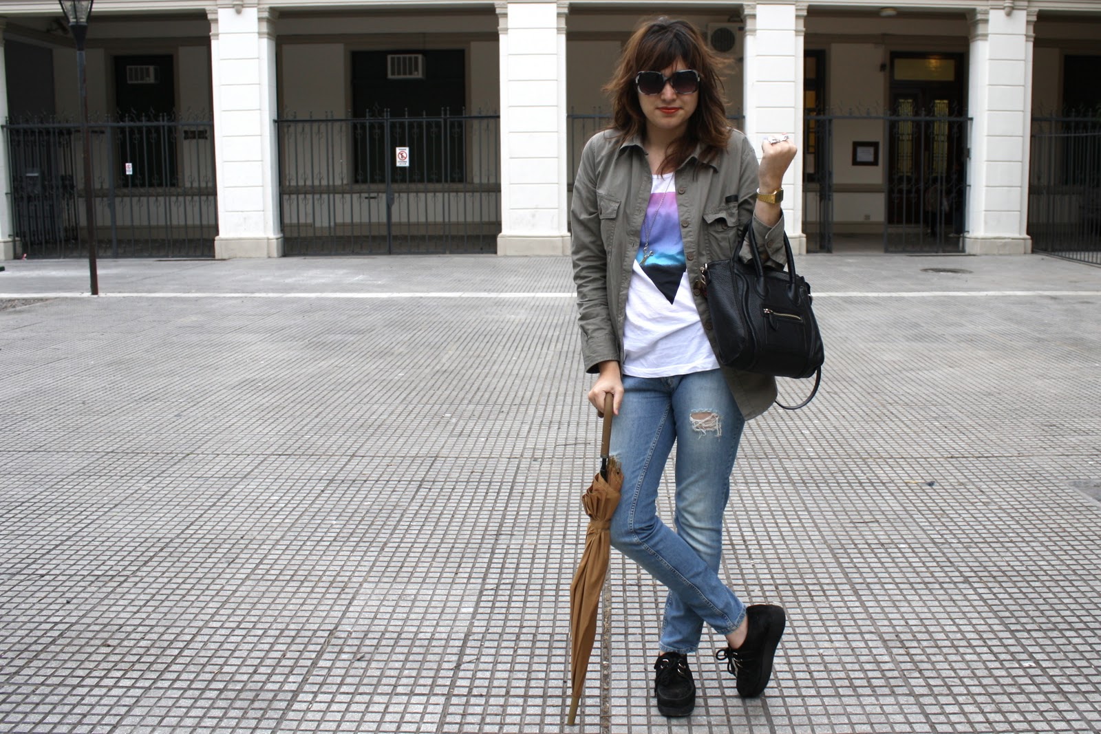 Buen viernes! Cómo están? Espero que la semana haya sido buena y estén proyectando su finde! A mí se me viene una súper movida, porque hoy tengo un día de locos ( no paro! ja) , el sábado un casamiento y el miércoles rindo un final! Por lo que tengo que estudiar! jajaj No sé cómo haré todo pero, ya veré! Tiempo al tiempo! Por lo pronto, vamos a lo nuestro. Este fue uno de esos días, que caracterizo a esta semana, que no se sabía si iba a llover o no! jajaja De ahí que me ven con paraguas! La idea era usar la camisa verde militar, me gusta cómo queda los días de lluvia y la remera que adoré por su estampa desde que vi la campaña. Veamos cómo quedo….