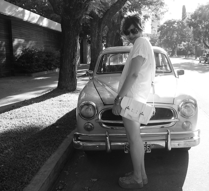 Me encantaron las fotos,que lindo ese auto y que bueno que estas en Pinarmar en la playita,re lindo.Yo nunca usé un total white,sí blanco&negro,pero toda de blanco,que yo recuerde ahora,no.Me encantó el bolsito.Saludos Pri,pasala genial♥