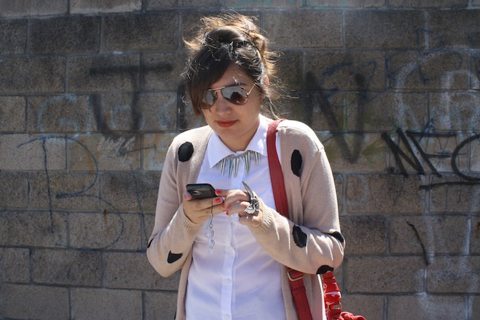 Vamos al tema del día, el outfit de hoy. Sería una especie de adelanto de «tendencias» adaptadas al clima de hoy! hahaha Porque digo esto?, por lo siguiente! La camisa será la vedette de la temporada, desterrando a poleras y camisetas! Y nada mejor que sumarle un gran plus como cuellos decorados y en mi caso el collar (muy in) que lo destaca.. Además no puedo olvidar los accesorios en rojo, color que han elegido varias marcas como el color de la temporada Otoño-Inviero 2012. Y por último, los lunares XL, siguen vigentes y vuelven con todo!! Marcas como Complot, les han dado un lugar preponderante en su última campaña.