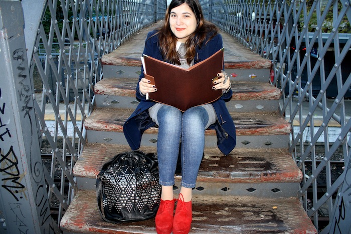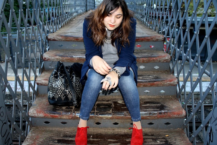 me gusta la combinación de zapatos rojos + montgomery azul. Un acierto total.