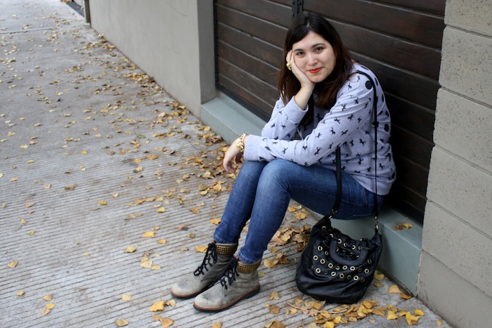 Me encanto el buzo y el detalle de las tachas de los borcegos, un interesante contraste con los brillos del cuello.