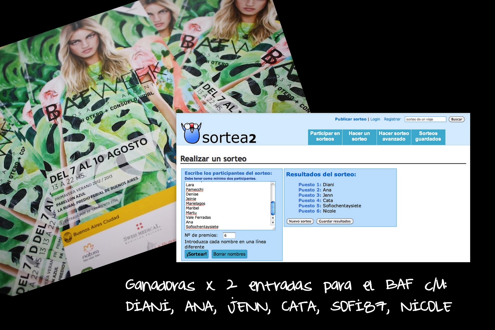 Pd: Aquí las ganadoras de los sorteos. Recuerden que les estoy mandando mail pero para las ganadoras de las entradas del BAF, las mismas se retiran (como ya les anticipe) el martes a las 17:00hs en la entrada de la Rural.