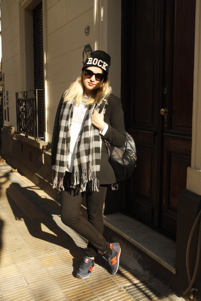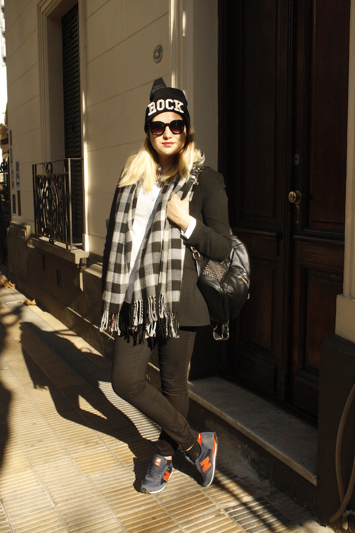 Así como mi madre solía decir que «cuando era chiquita ya era grande» para referirse a una persona que sin dudas se sacaba edad cuándo tenía más que ella, yo les digo: cuando era chiquita se llamaba escocés. Pues bien, esta temporada sin dudas el escocés- o tartán como lo llaman ahora-, ha vuelto pisando fuerte y lo estamos viendo hasta en la sopa. Pero más que volver, no nos engañemos, nunca se ha ido, estando siempre vigente. Esta estampa que ya  lucían los escoceses en el siglo XIII, sin dudas se ha vuelto atemporal y seguro algo con ella tienen en el guardarropa! Así que ahora aprovechando que es tendencia – tienen la excusa perfecta- a revolver el placard para  usarla! Fue así que me tente en usar esta bufanda – que data hace años- con un escocés no tan tradicional, que combina el celeste y el negro de un modo perfecto. ¿Qué les parece?